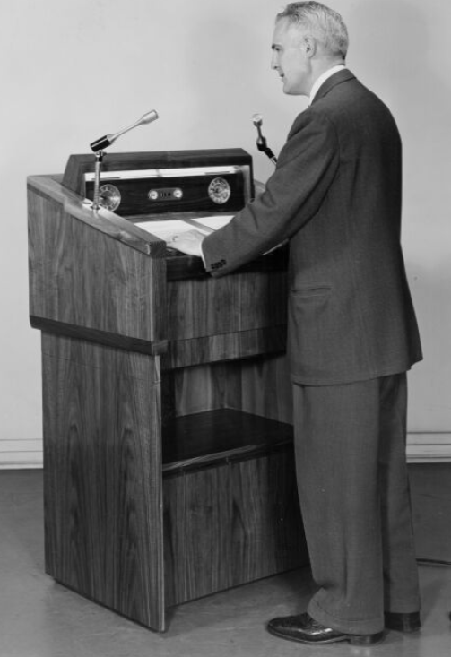 But that’s not the whole story. I later contacted a private IBM museum I found in the United Kingdom. The helpful staff there were able to unearth even more information for me about the lectern. As it turns out, IBM’s Time Equipment Division—the same folks who built toll booths along America’s highways in the 60s and 70s, IBM branded scoreboards, and punch clocks for recording work hours—manufactured these lecterns starting in 1954. Designed with a blend of elegance and functionality, they were constructed from walnut veneer and featured an array of futuristic controls for their time. The lecterns boasted adjustable heights and angles, built-in clocks with edge-lighted dials, indirect lighting, and mechanisms for microphone management. They were often sold to institutions that valued precision and prestige, including universities and governmental bodies. A closer look at IBM’s history reveals that their focus on executive lecterns even predated the 1950s. In the 1940s, IBM created a custom lectern for President Franklin D. Roosevelt, incorporating shielded mechanisms suitable for high-security events. This dedication to innovation set the stage for the 1954 design—a product meant to impress academic and business audiences.